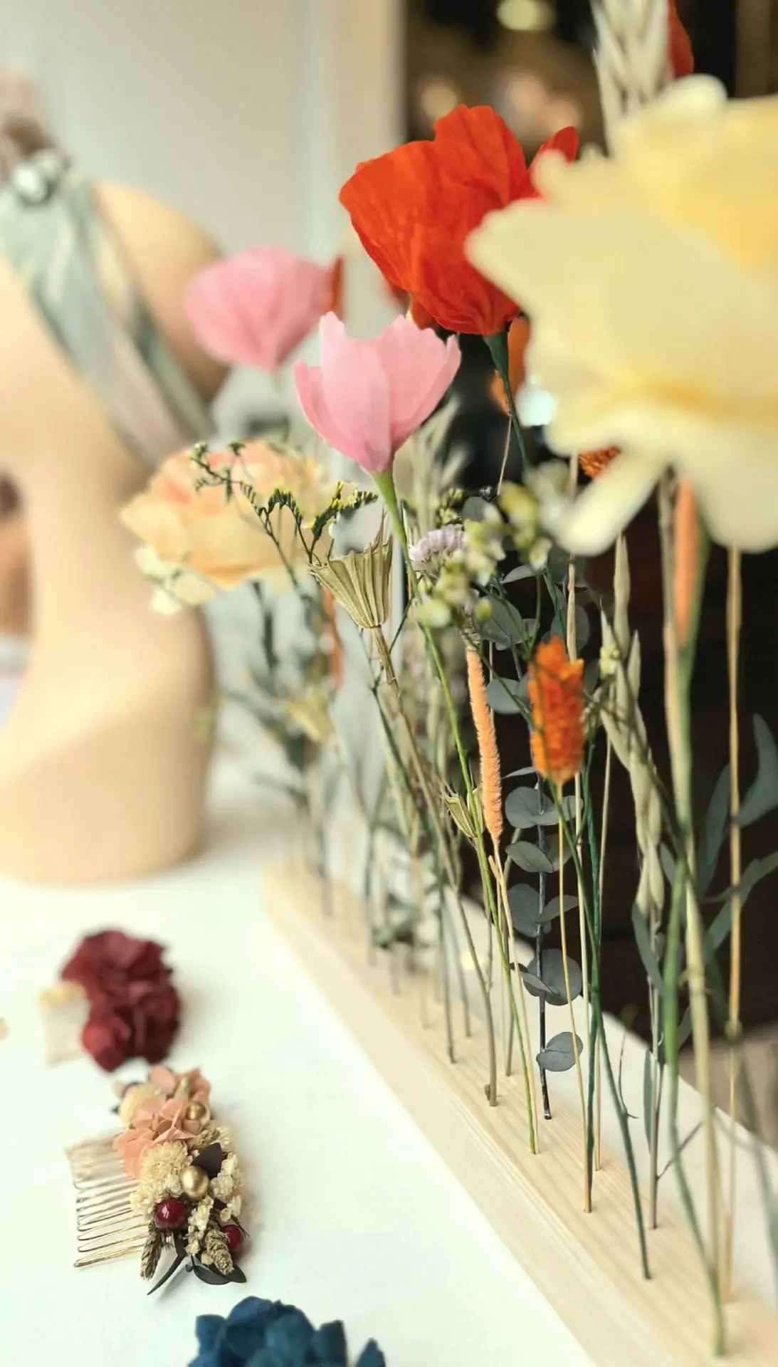 Nous travaillons la fleur séchée et réalisons des fleurs en papier à la main pour créer des compositions uniques et durables, pensées pour embellir vos moments les plus précieux.